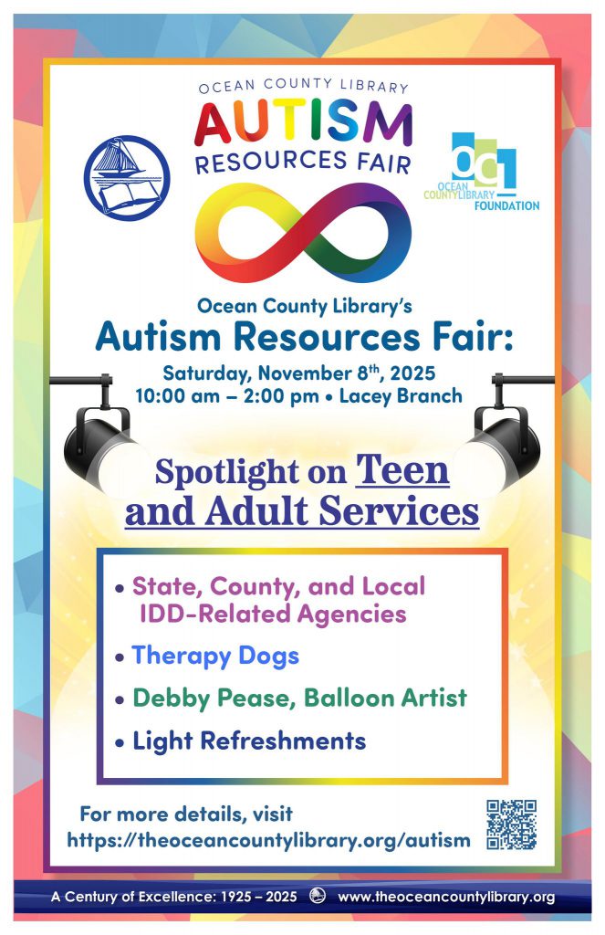 The Ocean County Library will be hosting an Autism Resources Fair on Saturday, November 8, from 10:00 am – 2:00 pm at the Lacey Branch.