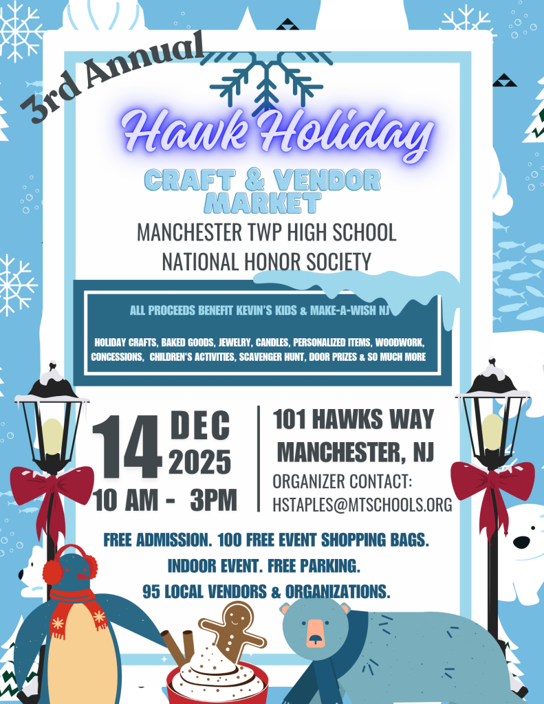 Join us at this Indoor Holiday Market hosted by Manchester Twp High School’s National Honor Society on Sun., Dec 14th for festive fun and the perfect holiday gifts for everyone.