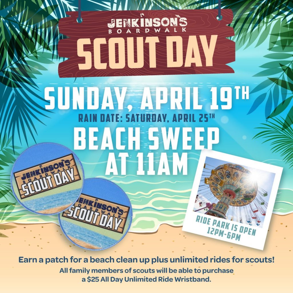 Scout Day returns to Jenkinson’s Boardwalk on Sunday, April 19, featuring a beach sweep at 11:00am followed by the Ride Park open from 12:00pm–6:00pm.