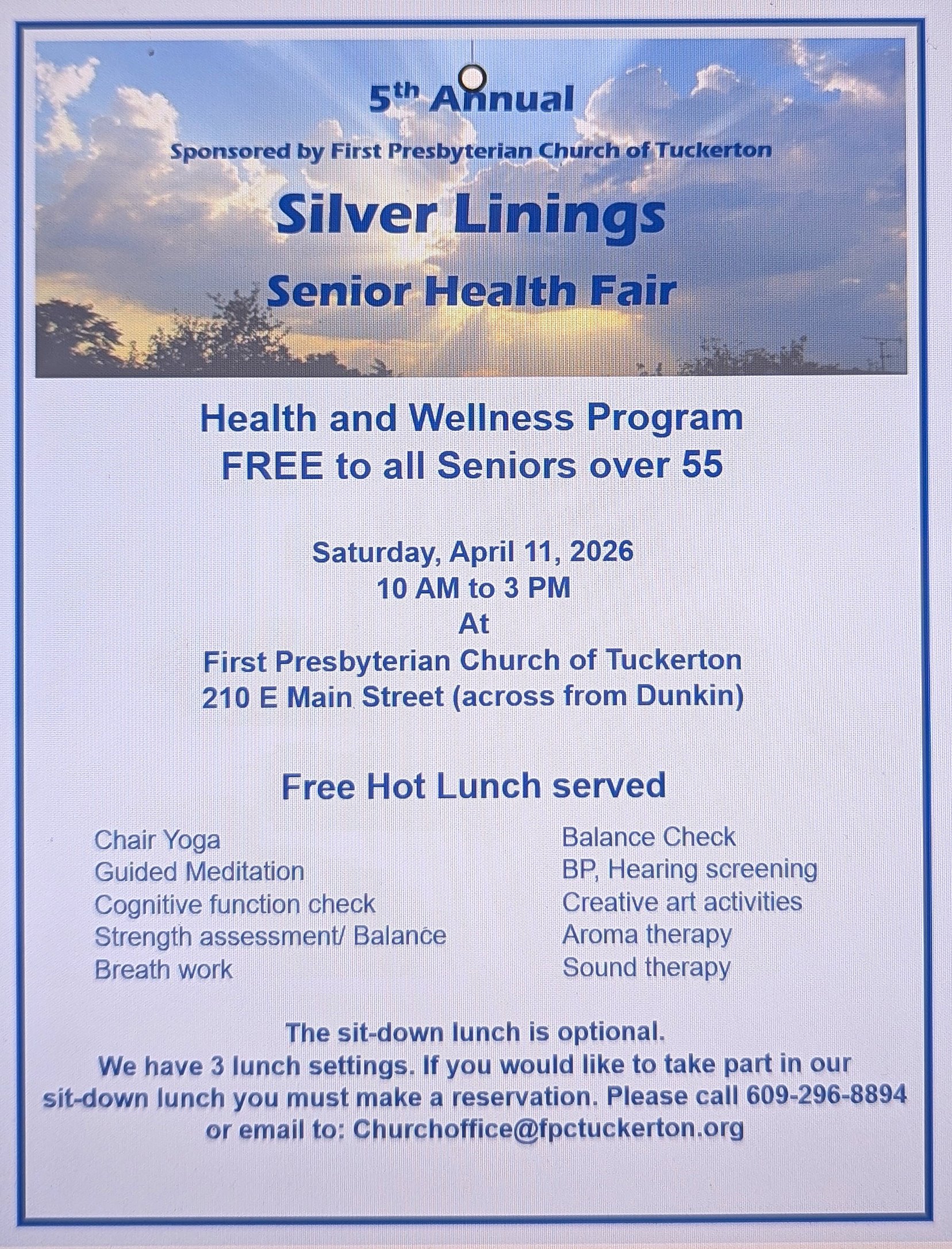 The sit down lunch is optional. We have 3 lunch settings. If you would like to take part in our sit down lunch you must make a reservation. Please call 609-296-8894 or email: ChurchOffice@fpctuckerton.org