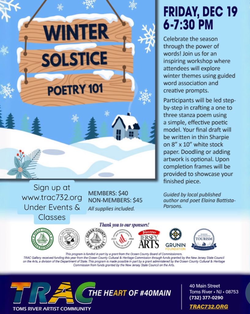 Join local published author and poet, Elaina Battista-Parsons for this inspiring workshop where you will explore winter themes using guided word association, and creative prompts.