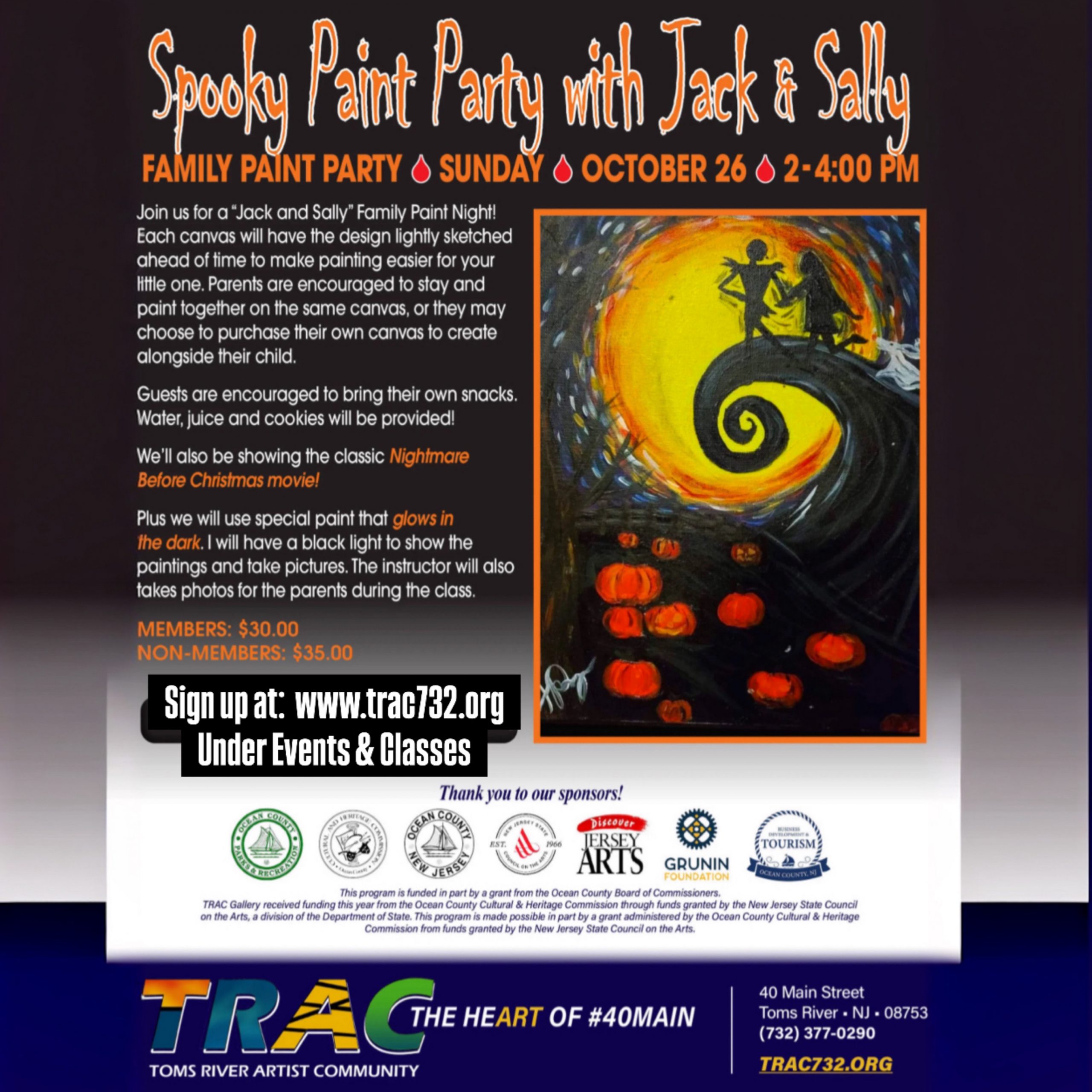 TRAC Toms River Artist Community 40 Main St., Toms River, NJ, United StatesSunday, October 26, 2-4 PM Sign up at https://www.trac732.org/classes-and-events Join us for a “Jack and Sally” Family Paint Night! Each canvas will have the design lightly sketched ahead of time […]